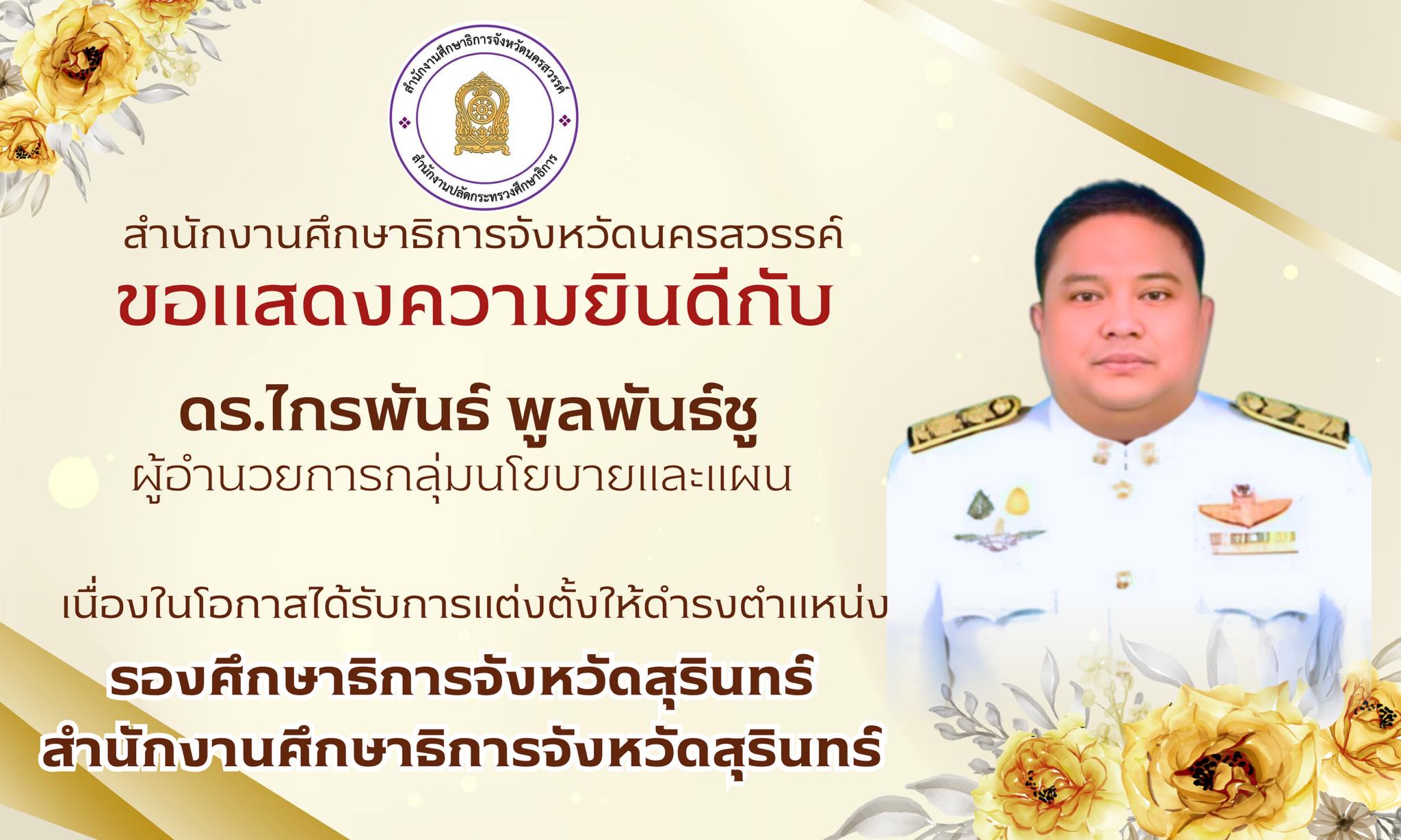 ศธจ.นครสวรรค์ ขอแสดงความยินดีกับ "ดร.ไกรพันธ์ พูลพันธ์ชู" เนื่องในโอกาสย้ายไปดำรงตำแหน่ง รองศึกษาธิการจังหวัดสุรินทร์
