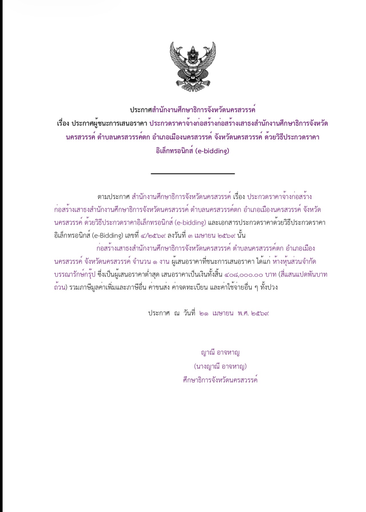 ประกาศผู้ชนะการเสนอราคาโครงการก่อสร้างเสาธงสำนักงานศึกษาธิการจังหวัดนครสวรรค์ด้วยวิธีประกวดราคาอิเล็กทรอนิกส์ (e-bidding)