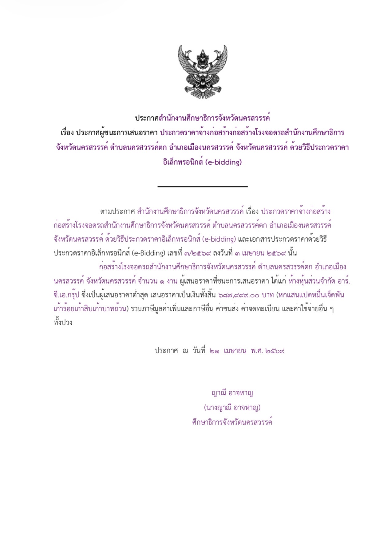 ประกาศผู้ชนะการเสนอราคาโครงการก่อสร้างโรงจอดรถสำนักงานศึกษาธิการจังหวัดนครสวรรค์ด้วยวิธีประกวดราคาอิเล็กทรอนิกส์ (e-bidding)
